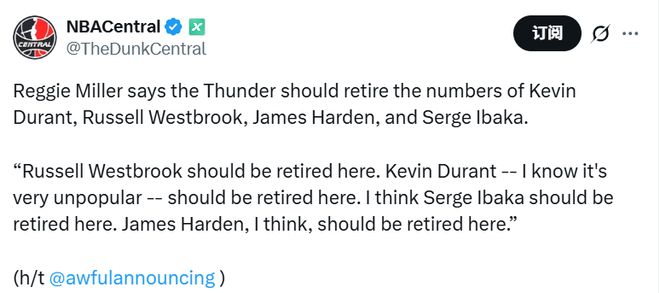 米勒建议雷霆退役4人球衣!美媒质疑哈登资格:只打7场首发没戏